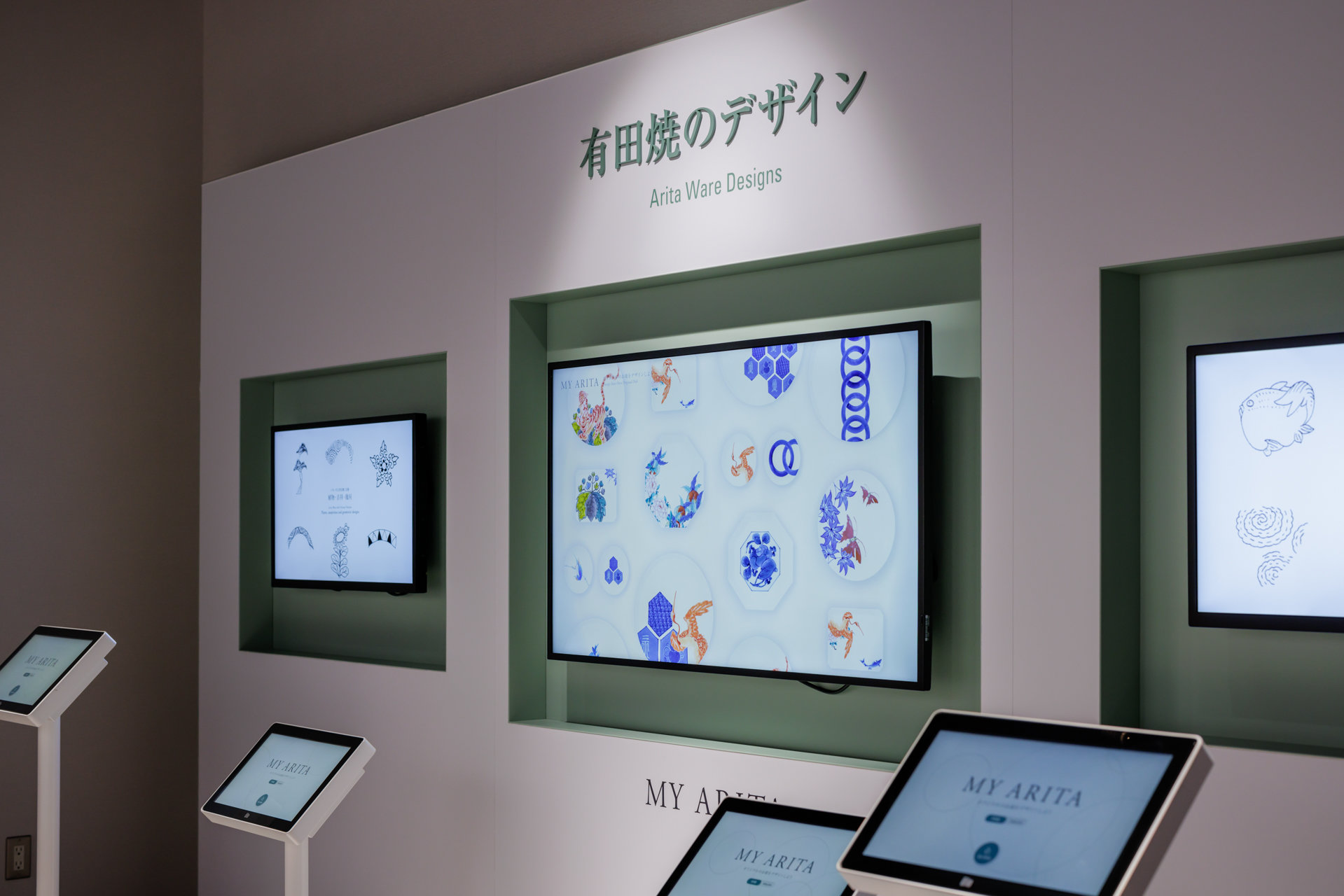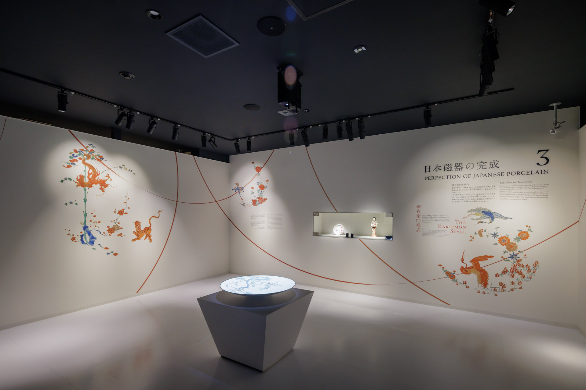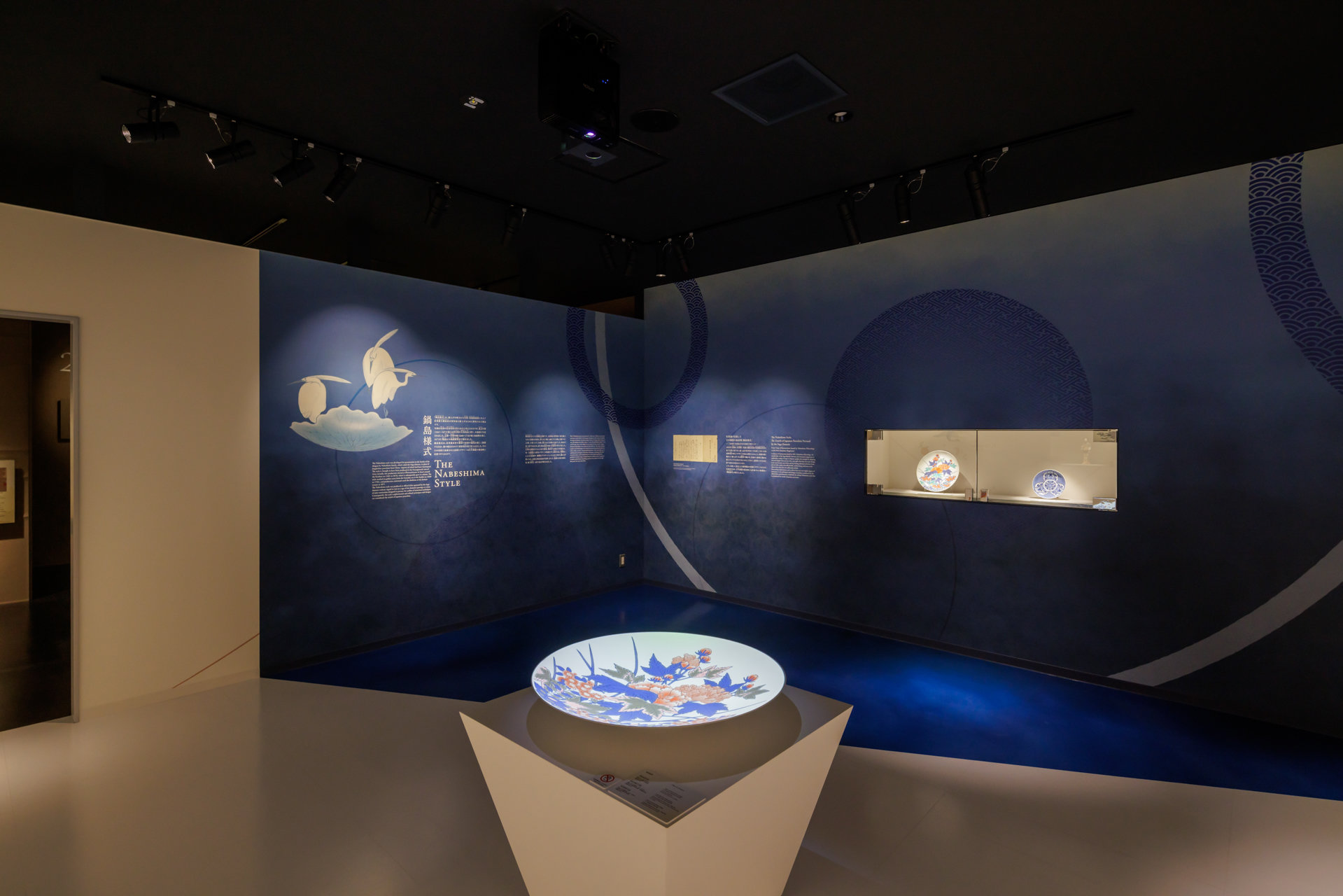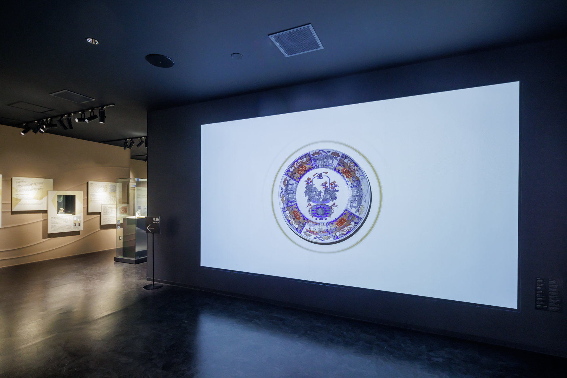 在第1展示室的入口处,使用光雕投影把点缀有田烧的各式设计投影至盘型的屏幕上。一边在感受时代变迁设计的7个小房间中参观,一边伴随着故事体会有田烧的400年。