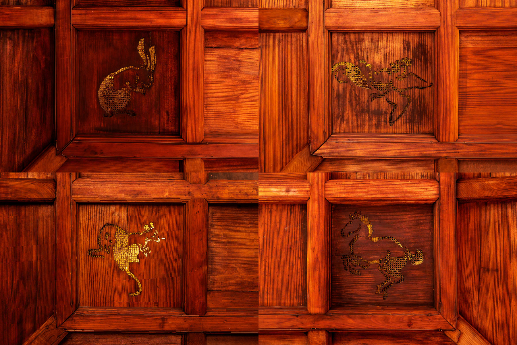 楼门二楼天花板的雕刻画(上排左:兔、右:鸡、下排左:鼠、右:马)