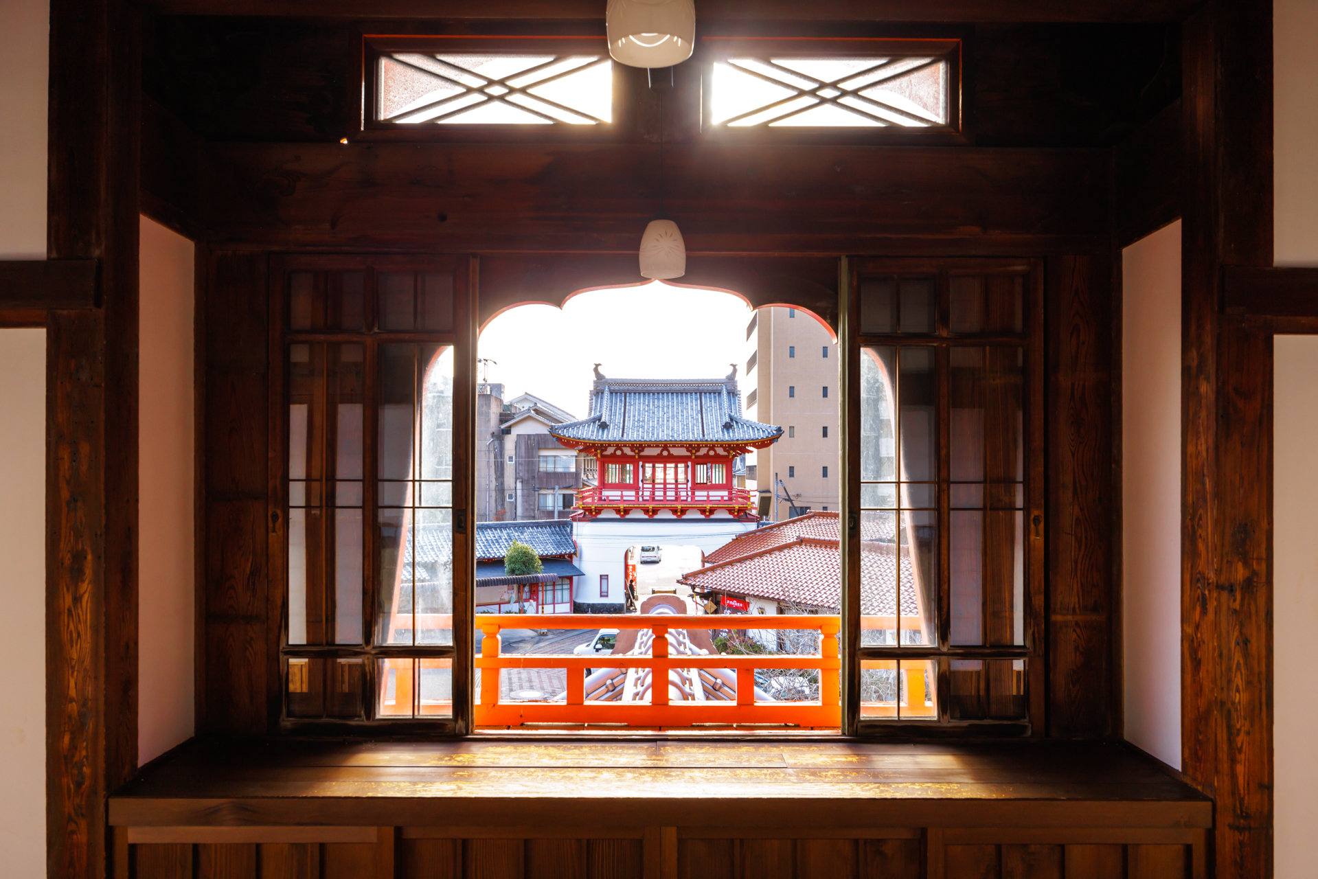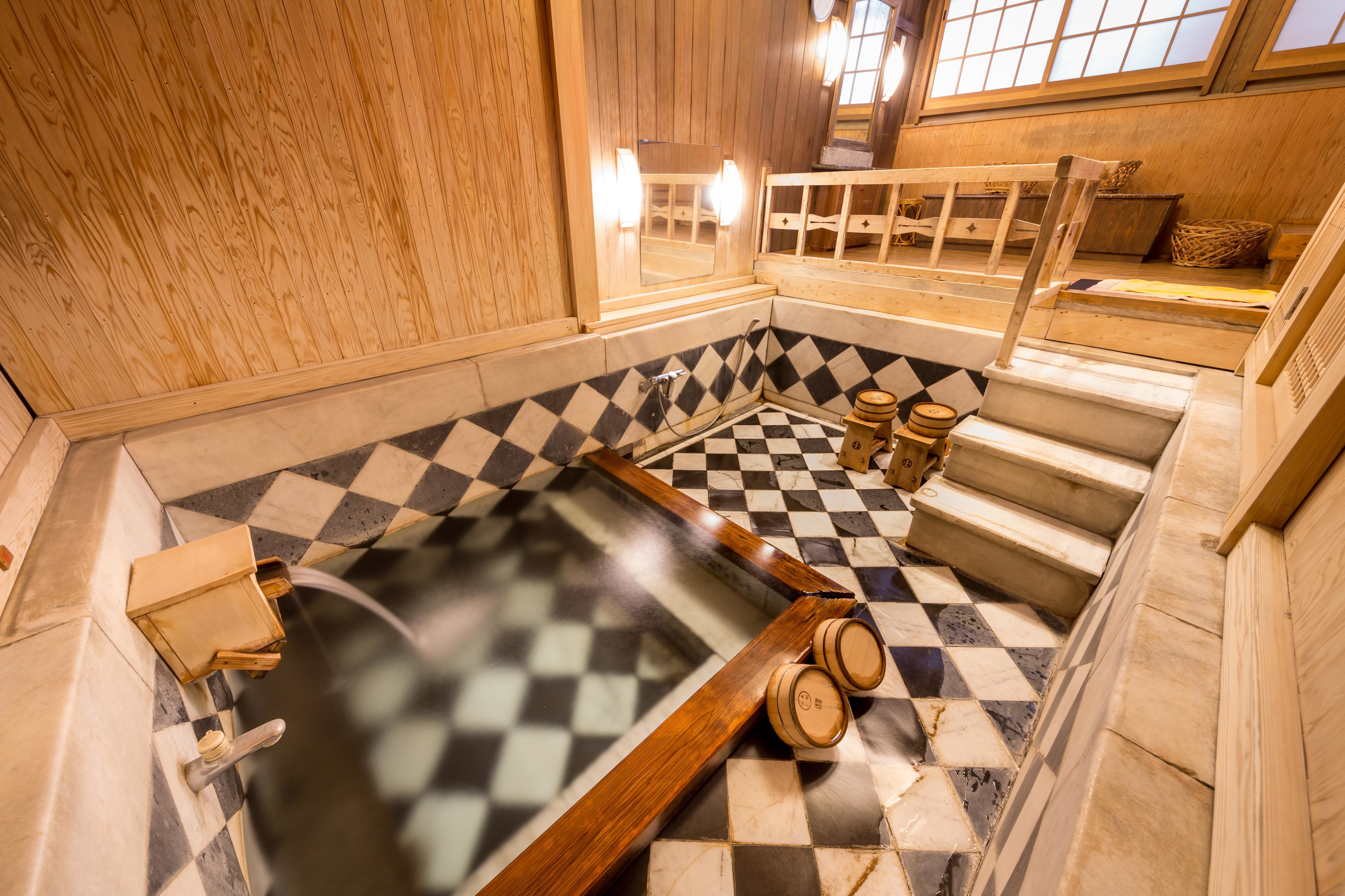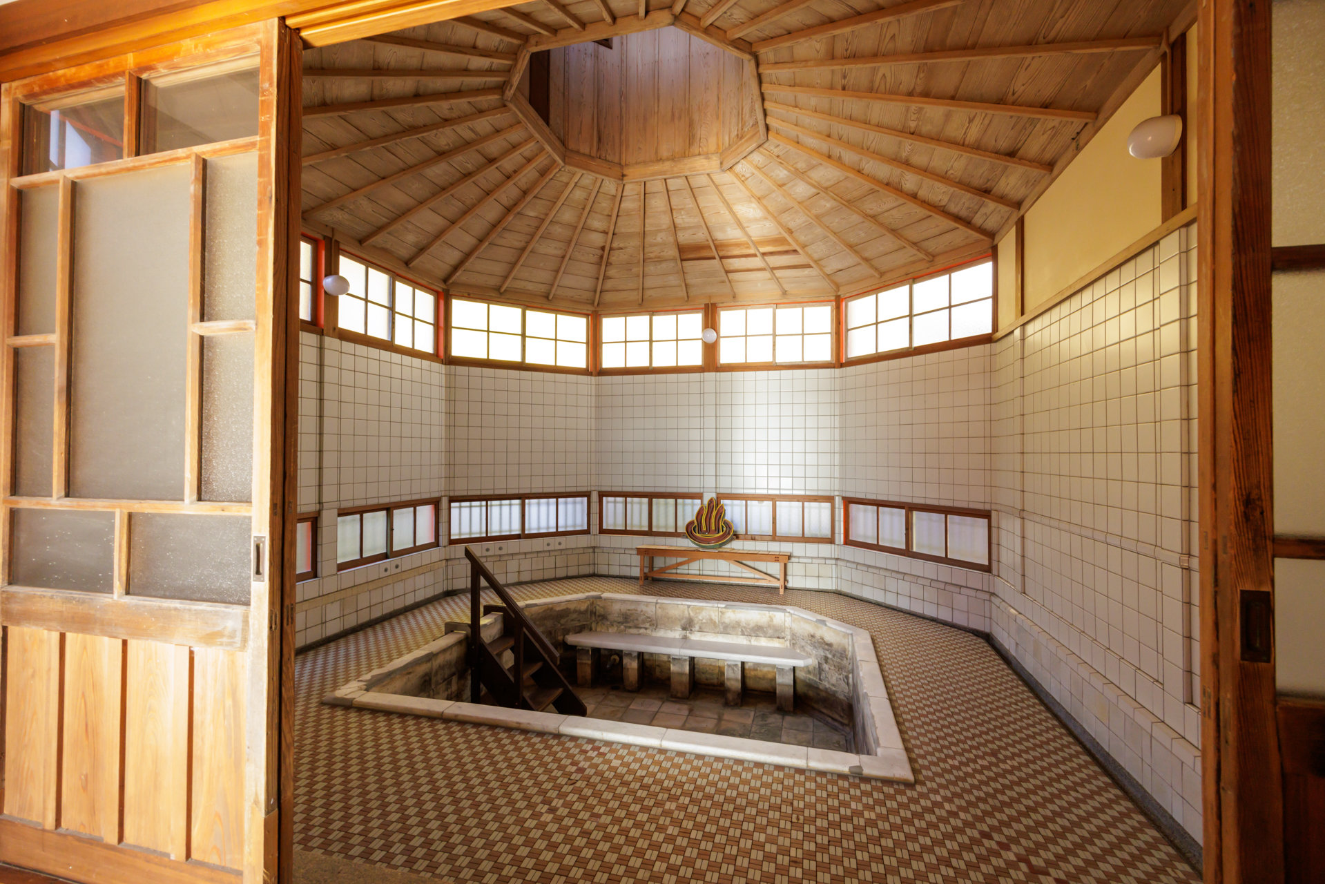 如果想拍摄这个楼门,请前往新馆*二楼。新馆是20世纪初建造的公共浴池,其亮点是大理石的浴室和马约里卡瓷砖等(2003年修复)。而且还有过去建造作为该地主君(领主)专用的“主君浴池”等,也欢迎各位包场享受温泉浴。