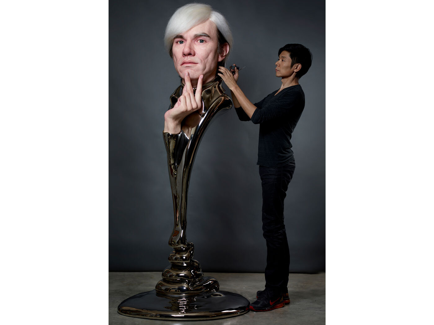 化妆师出身的雕塑艺术家Kazu Hiro将在天保山大阪文化馆举办的“钻研:025大阪关西国际艺术节”上展出他的雕塑作品“安迪·沃霍尔”。 Kazu Hiro《安迪·沃霍尔》,2013,铂金固化硅胶、头发、树脂、镀铬,213x91x91厘米,艺术家收藏