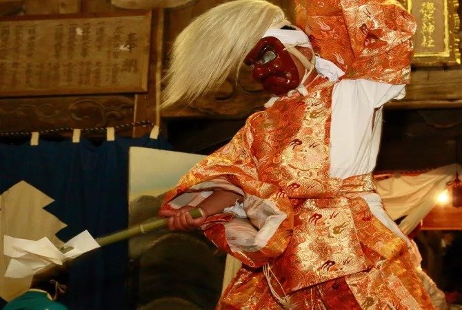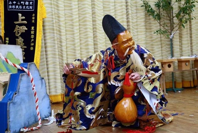 将神乐作为祭品进行表演的传统祭典只有宫古市才有。在其他时候,比如在神乐祭期间,您可以在邻近的丰前或福冈县的其他地点将其视为一项活动,而非神道教仪式。宫古举行的传统神乐祭代代相传,从当天晚上 7 点到 8 点左右开始,一直持续到午夜。过去,祭典会一直持续到黎明,这时“岩户”就会打开,照亮周围,就像神话中的“天岩户”一样。