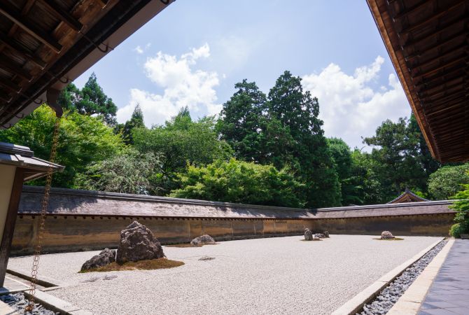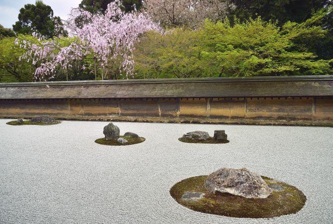龙安寺方丈庭园是京都最知名的庭园之一。事实上,由于此处非常有名,因而在全球成为了日式庭园的代名词。龙安寺有着传统建筑和园林,是联合国教科文组织世界遗产,也是造访京都的游客必去的地方。