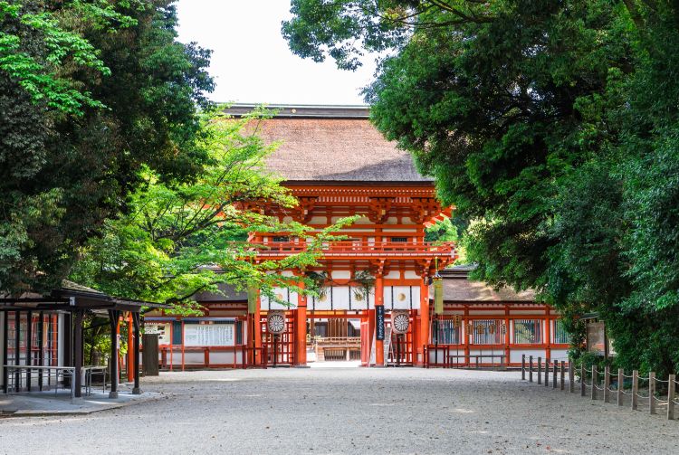 糺之森中最老的阔叶树已有 600 年树龄。穿越森林的漫长步道即来到神社宏伟的入口。