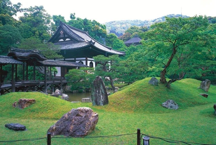 高台寺的庭园精美雅致,池塘周围环绕着枫树,覆顶步道的设计让人联想到弯曲的龙背,还有一座竹林和象征浩瀚海洋的枯山水庭园。