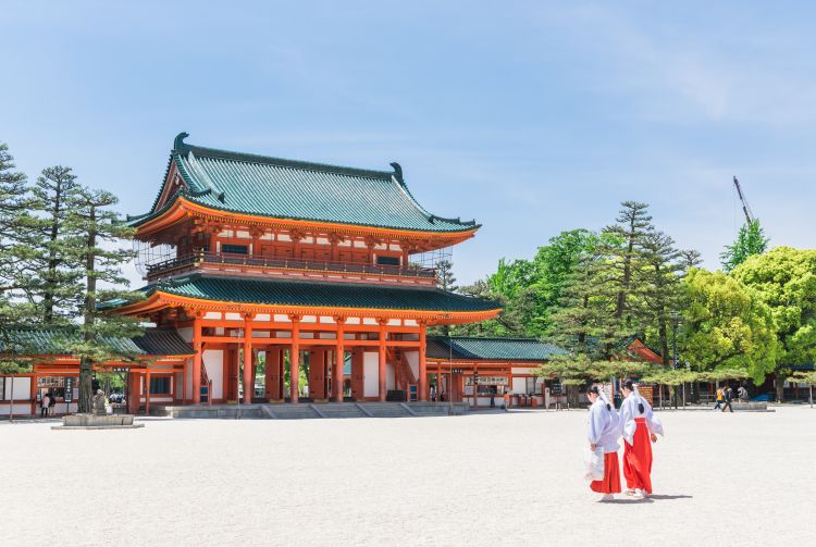 平安神宫的砾石庭院占地辽阔,可将主殿一览无余,主殿为平安时代 (794-1185) 皇居的微缩版。神宫传统的红柱和绿瓦使其显得尤为醒目。