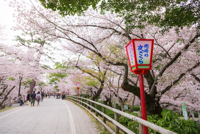 冈崎公园四季皆美,被日本樱花协会 (Japan Cherry Blossom Association) 评选为"日本樱花名所百选"之一。每年三月底到四月初,城堡周围将会呈现一片花团锦簇的美丽景象。加入当地人的行列,在公园和乙川沿岸的大自然中享受野餐。