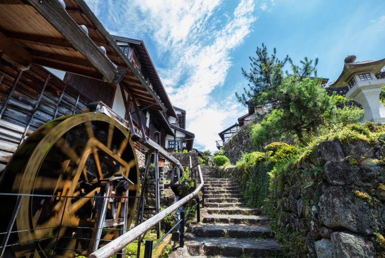 离开小镇时,欣赏该地区美丽风光的最佳地点就是山顶。中山道从这里启程,蜿蜒穿过森林和稻田,经过激流潺潺的瀑布,还有保存完好的美丽农舍和水车。