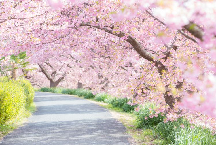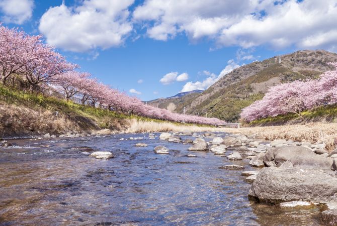 河津有 8,000 棵樱桃树,因花期早而备受游客们的喜爱。不仅如此,这些樱花还以花瓣大、粉亮颜色而著称。河津樱花赏樱节是春季非常受欢迎的活动。