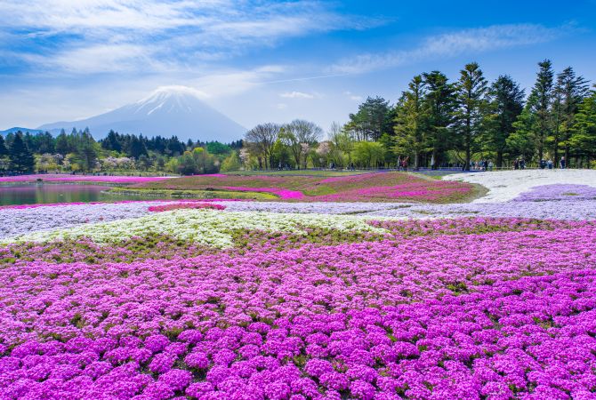 当您沿着各种粉红色和紫色的花田漫步而行,在地平线远处高耸的富士山衬托下,您将沉浸在如梦似幻的景色中。在晴朗无云的日子,蓝天和苍郁青绿的排排树木,围绕着大片的紫色、粉红色和白色花田,形成令人赞叹无比的美景。
