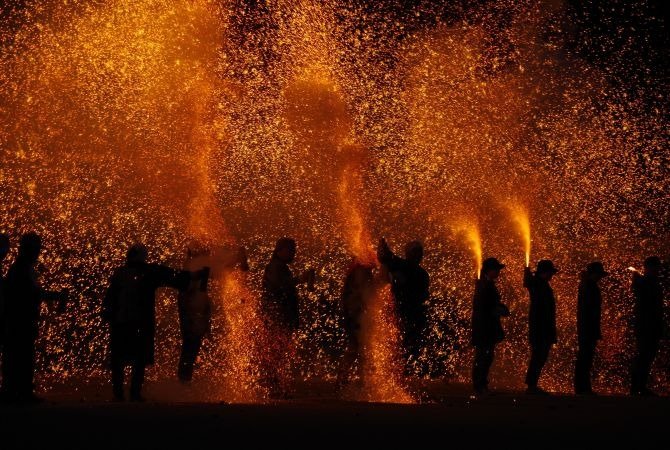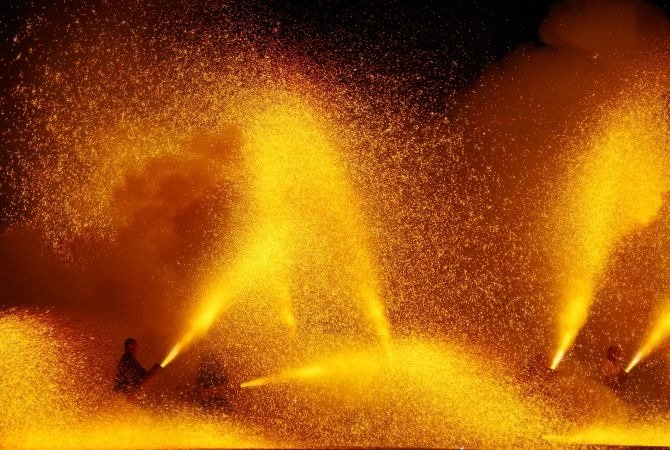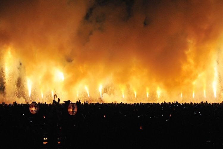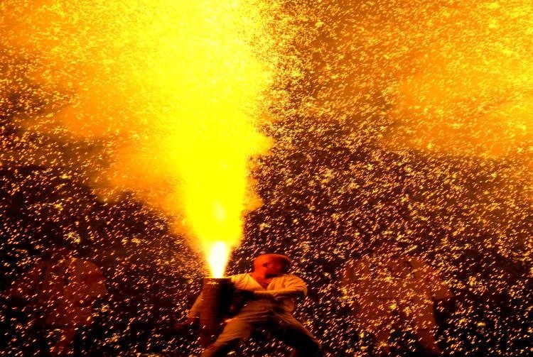 当夜幕降临时,身着传统服装的表演者们带着装满火药的大竹筒登上舞台。火柱突然喷出,射向 10 米的高空,夜空中遍布火焰和烟雾,火花倾泻而下,降落到下面的人身上。