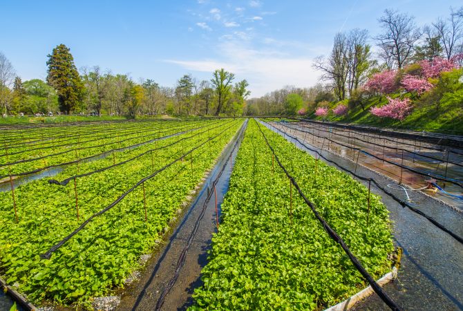 大王山葵农场看起来更像是一处艺术胜地,而非一座农场。汩汩的河水流经农场,在经过耕耘的河床上,井然有序地种植着一株株山葵,此番情景,不由使人联想起禅宗风格的庭园。