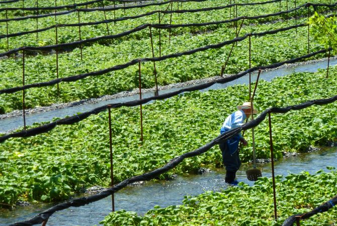 虽然在日本某些地区的河床上,自然生长着野生山葵,但它们是出了名的娇气,只有在十分清洁干净的环境下,才会繁茂生长。好在农场附近有日本阿尔卑斯山富矿冰雪融水的滋养,加上工人们的精心照料,大王山葵农场的作物才得以蓬勃生长。