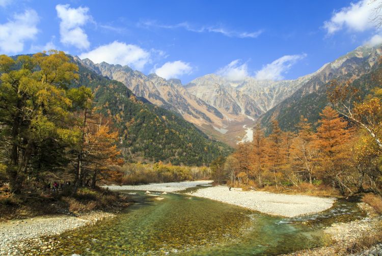前往明神一之池后,再继续往前走,很快您就来到日本阿尔卑斯山的范围了。一路上,山谷树木苍翠,种类繁多,混杂着落叶松、桦树与铁杉。这里也是当地野生动物的栖息地,如鹿、日本髭羚、狸猫、狐狸、数量众多的猴子,偶尔也会有熊出没。