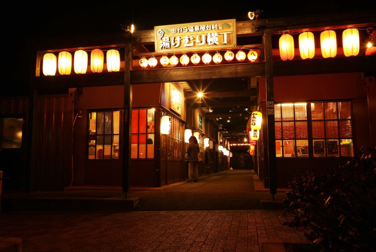 汤烟横丁意为"充满温泉水汽的小巷",泡过温泉后,最适合来这里大快朵颐一番。汤烟横丁就在足浴场旁边,是一条狭窄而热闹的小巷,巷子里满是小吃摊,各式美食琳琅满目,令人眼花缭乱。这里有肉串和蔬菜串等各种炸串,有拉面、荞麦面和海鲜等。汤烟横丁整条小巷挂满了红灯笼,巷子里的餐馆一般只招待大约九个客人。在这里就餐,不仅能感受到一种温馨亲切的氛围,还有可能发生一段美丽的邂逅。