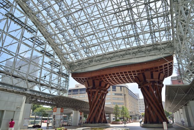 金泽站始建于 1898 年,2005 年进行了一次全面翻新,添加了玻璃与钢结构组成的拱顶以及类似鸟居(日本神社的大门)的巨型木门,呈现出独具特色的未来主义美感。金泽是整个北陆地区的文化和经济中心。