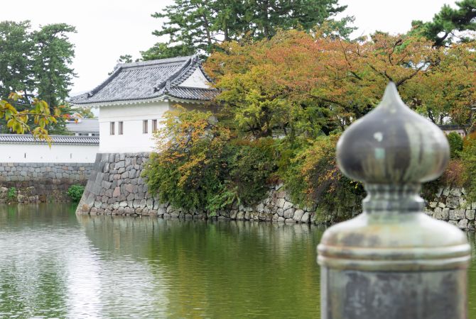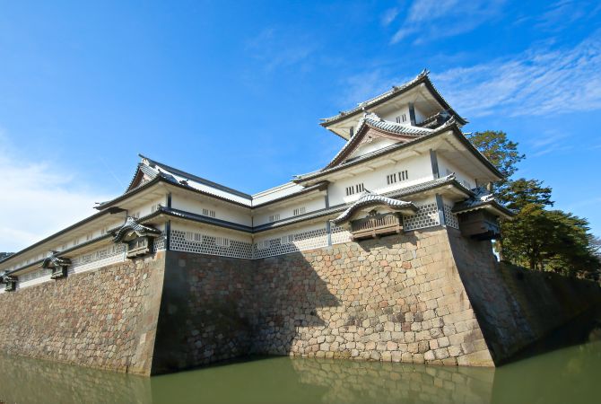 金泽城位于金泽城公园内,位于兼六园正对面,部分区域经过修复得以重现。前田氏自 1583 年开始建造金泽城,并将其作为家族居城,至 1869 年已传承了 14 代。几个世纪以来,由于自然灾害,原来的城堡多次被火灾摧毁,如今,其中的结构已所剩无几。金泽城至今留存下两处建筑,一处是石川门,一处是三十间长屋。金泽城在明治时代 (1868-1912) 是日本陆军军团司令部驻地,之后作为金泽大学的校本部直至 1996 年。