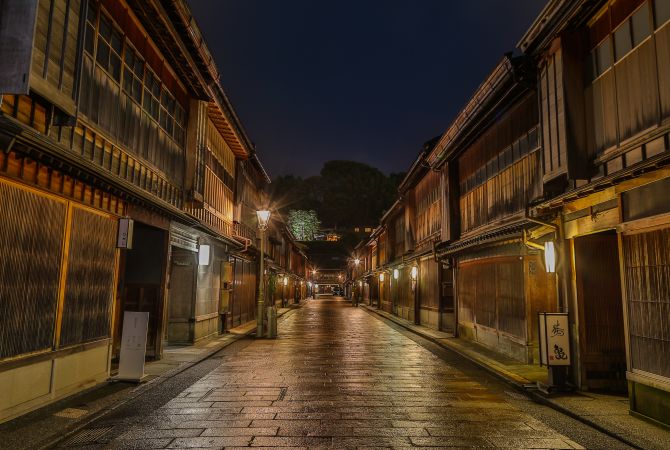 美丽的木质茶屋保存完好,这里也是官方指定的日本文化财产。东茶屋街过去是非常受欢迎的娱乐区,艺妓会在这里表演,为贵族和富商提供消遣娱乐。此地的艺妓文化依旧盛行。到了傍晚,您可以听到从茶屋传来三味线与鼓的合奏。艺妓则会载歌载舞,并进行传统的宴会游戏。