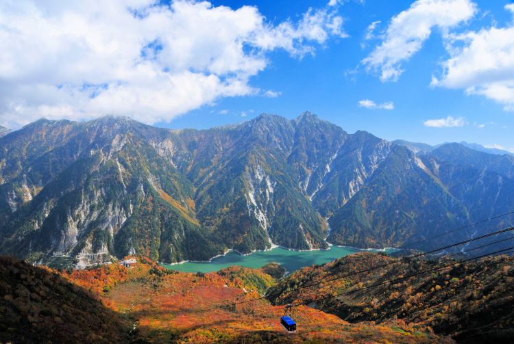 立山黑部阿尔卑斯山脉路线穿过高低起伏的山地,一直延向日本北阿尔卑斯山的中心地带。黑部水坝是一项工程壮举,非常值得参观。