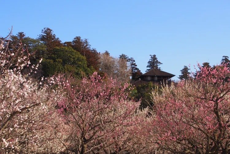 虽然大多数日本园林都以樱花而闻名,但偕乐园以梅花著称。每年,约 3,000 棵梅树于早春绽放,将整座庭园变成了红、粉、白三色交织的天堂。在偕乐园举行的水户梅花节是一项盛大的活动,吸引了来自日本各地的人们。