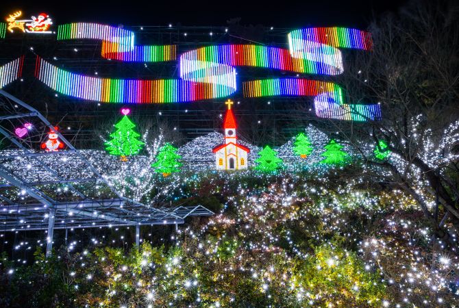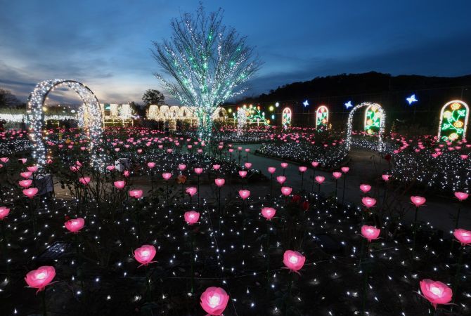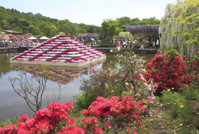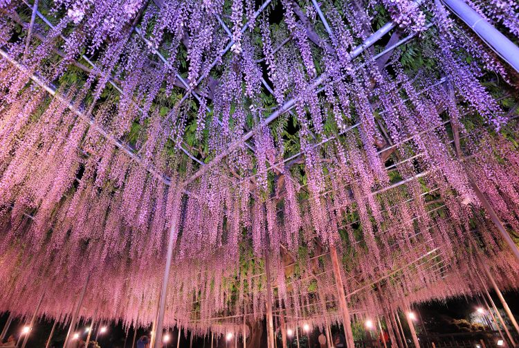 足利花卉公园以冬季的夜间灯光和赏花闻名,而且紫藤会在 4 月底到 5 月中旬大面积盛开。此外也会举办"春日赏花祭"(Spring Flower Festival),展示盛开的郁金香与樱花花海。