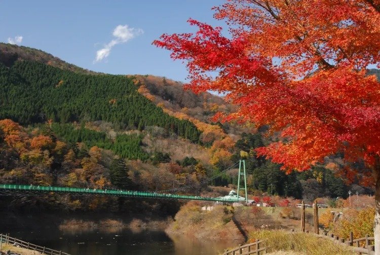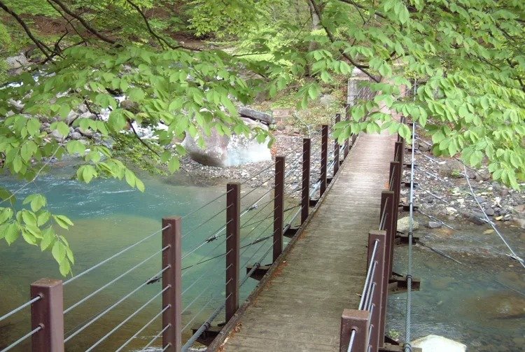 在泡温泉的间隙,不妨细细欣赏帚川沿岸的美景以及山谷里郁郁葱葱的山坡。帚川流经山谷,河水从群山奔流而下,形成了此地的近百座瀑布。吊桥横跨山谷,走在桥上,壮观的山色一览无余。