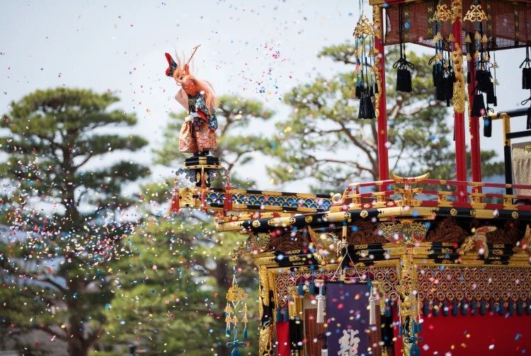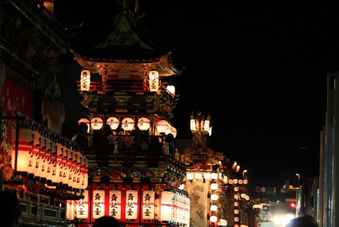 到了傍晚,巨大又沉重的屋台就会由专门的队伍熟练地拉到街上巡行。笛子与弦乐器演奏的传统音乐,再加上摇晃摆动的灯笼,一起营造出了梦幻般的氛围,每年都有来自全国各地的人们前来见证。
