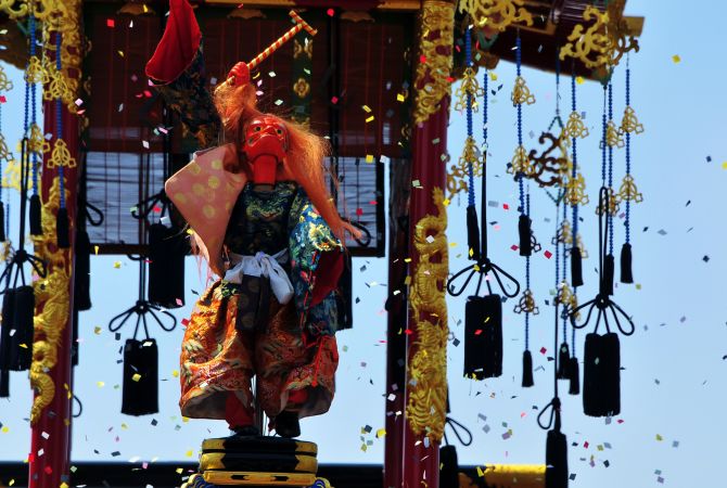 这场祭典的主角就是屋台。从早上到晚上,这些精致的屋台都会参与游行。部分屋台上面还会装设机关人偶。在接近中午与中午过后的这段时间,机关人偶就会开始"表演"传统舞蹈。若是天公不作美,仓库门会打开,屋台就会在仓库内展示。
