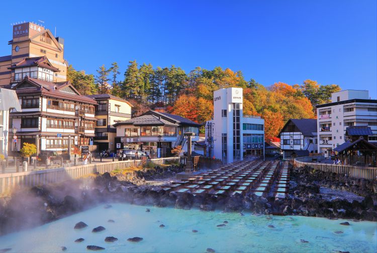 当水涌入绿宝石般的蓄水池时,阵阵热气翻滚而出。 草津温泉拥有日本最多的天然温泉水。 泉水温度高(约 55 摄氏度),酸度也高,据说可以治愈多种疾病,且对皮肤特别有好处。曾有数名德川幕府将军用水桶将泉水运往位于江户(今天的东京)的城堡。