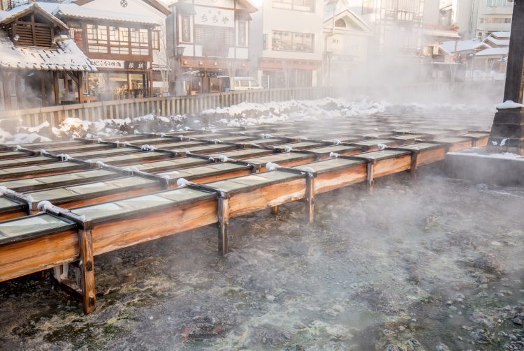 这个大型热水系统是草津温泉的象征和中心。独特的香味将带您来到镇中心的汤畑(字面意思为"热水田")。地热水直接从源头流到地表,沿着一系列相互连接的木制斜槽流动冷却,同时保留着其中的天然矿物质。
