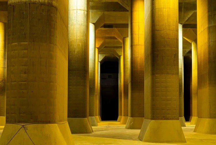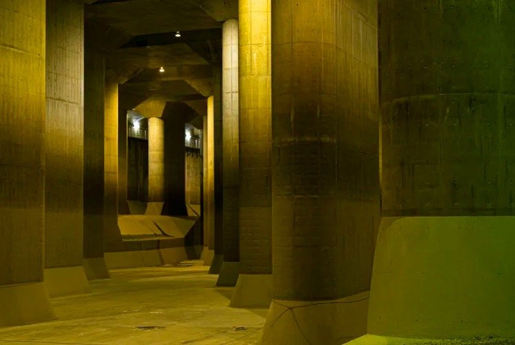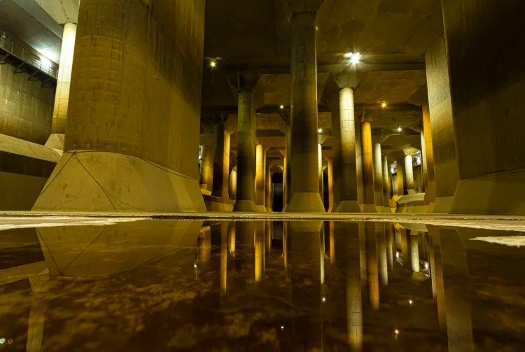 由于东京地势较低,在雨季和台风季节容易遭受洪水的破坏,所以政府建造了世界上最大的地下防洪设施,以应对任何潜在的灾害。该设施中心现在对公众开放,可以付费参观。