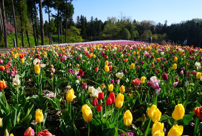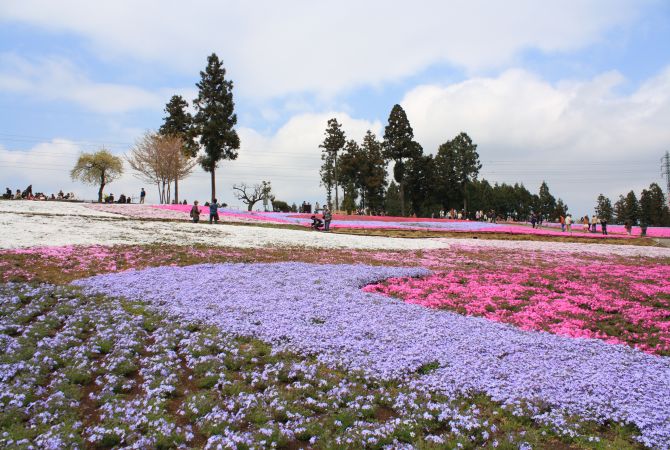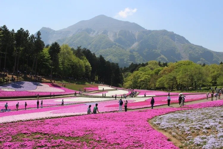 芝樱盛开时,整个公园会蒙上一层粉红色、紫色、白色的地毯。秩父羊山公园拥有九种不同的芝樱。超过 40 万朵花,覆盖面积达 18 000 平方米。曾精心设计这些花卉的种植与排布,以此构建五彩缤纷的图案,而且若是遇到晴好天气,花朵在阳光下变得明亮鲜艳,令人眩目。