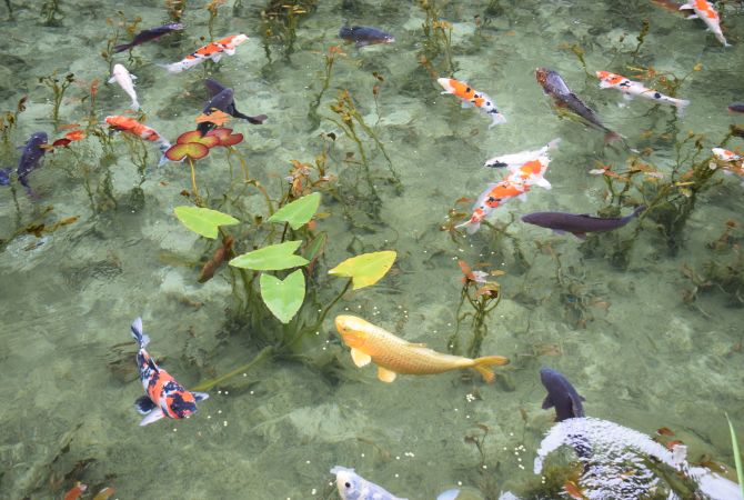 莫奈之池在初夏时尤其值得一游。在清澈的池水中,各色锦鲤悠游于浮叶的睡莲下,周边布满葱笼绿意和盛开花朵,不禁令人联想到法国绘画大师莫奈在 1920-1926 年之间的系列作品。
