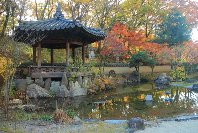 公园里有一座韩式庭院,院内有一栋复建的传统韩式山间别墅。这种别墅是 20 世纪以前韩国贵族经常出入的地方。