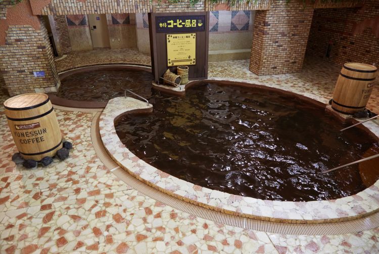 Yunessun 最著名的是温泉,还加入了您最喜欢的一些饮料和天然泉水,其中一种便是咖啡温泉。员工每天数次将自制的咖啡倒入该浴池。