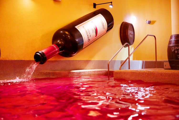 另一个以饮料为主题的沐浴体验是红酒温泉,配有一个 3.6 米高的巨大酒瓶。幸运的话,您甚至可以在现场观看葡萄酒秀,工作人员会向沐浴者喷洒一瓶小涌园葡萄酒。无论能否看到这场葡萄酒秀,红酒浴对于每个葡萄酒爱好者都是完美的体验。