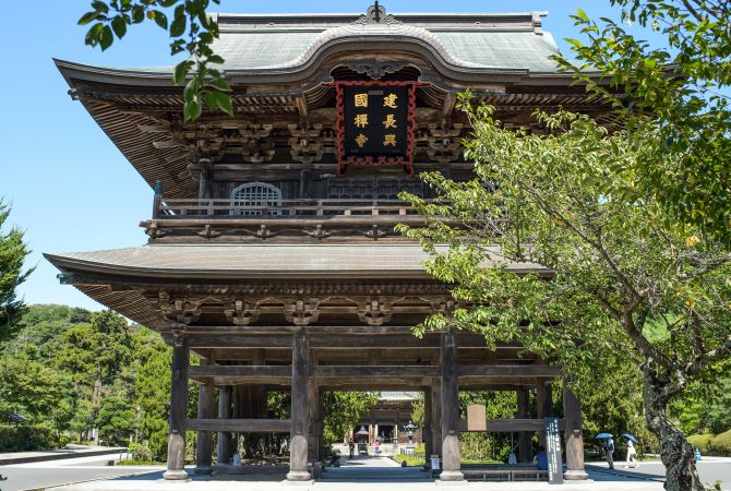1253 年创立的建长寺,最初是日本专修禅宗的寺庙。寺庙前傲然耸立着一株树龄 760 年的杜松树,象征这一座寺庙与宗派渊远流长的历史。庭院与梵钟皆为政府认定的国家遗产。