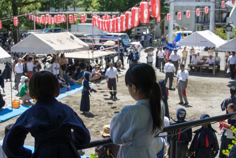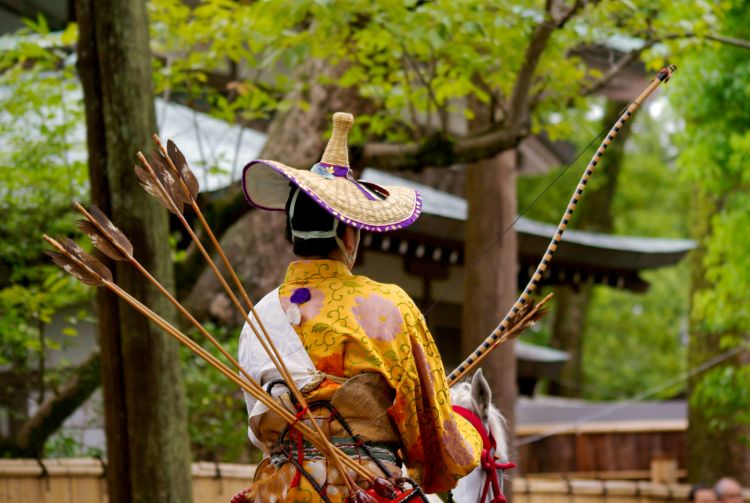 骑马射箭的流镝马竞赛在祭典最后一天登场。这是展露武士功夫的竞赛,所有参赛者都要策马奔驰射箭。