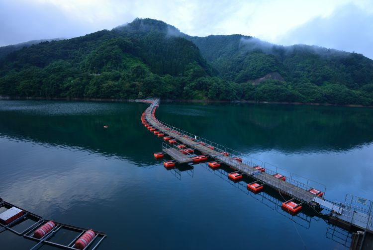 奥多摩湖上有一座人行浮桥,伸向湖心一小段。由于这座桥是使用空油桶制成,因此又名圆桶桥,官方名称则是麦山浮桥。