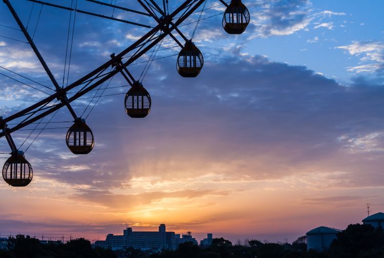 搭乘摩天轮可鸟瞰园区。园区内的摩天轮为全日本第二高,转一圈需要 15 分钟以上。天气晴朗时,还可在最高点远眺富士山。