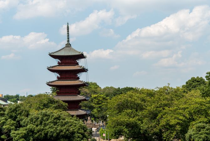 这座著名的寺院立于日莲上人圆寂之地,现为日莲宗的统领寺院。院内耸立着一座庄严的五重塔,建于 17 世纪左右,采用安土桃山时代的建筑风格,是公认的日本关东地区最古老的宝塔。