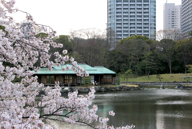庭园的中央水池潮入之池并非一个简单的水池。潮入之池的日语名称 (Shioiri) 意为"潮池",它的池水实际上是来自东京湾的海水。人们根据潮汐的涨落用水闸控制水位,因此池中的水一天之内都会有变化。记得在参观时要瞧一瞧水池内部,因为您可能会瞥见跟随海水而来的海洋生物,比如海鲈鱼和黑鲻鱼。