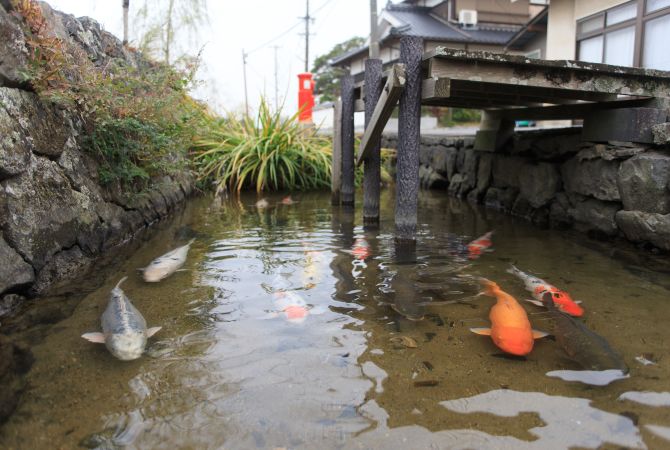 在传统武家屋敷周边欣赏清澈沟渠里悠游的五彩锦鲤