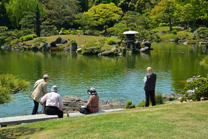 池塘是清澄庭园的特色景点,周围尽是精心雕刻的假山,以及日本各地的石头。走在横跨池塘的石头步道上,更增添置身于大型枯山水中的感受。