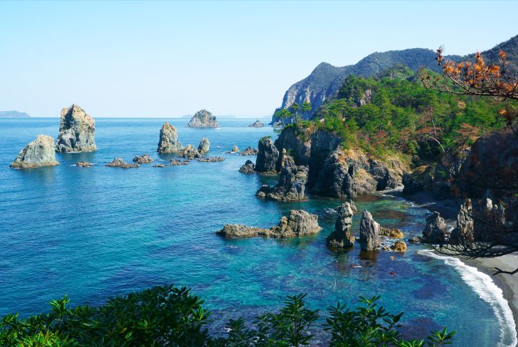 青海岛于 1927 年入选日本百景之一,为北长门海岸国定公园的一部分。探访陡峭的十六罗汉岩、岛见门海蚀洞以及其它许多大自然造就的奇岩怪石。