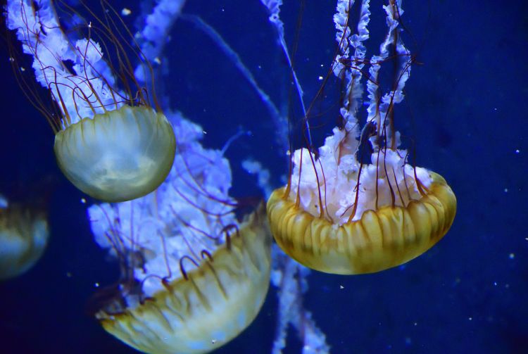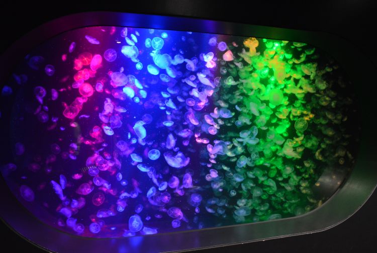 以灯光照亮的水族箱共展出超过 60 种水母,游客能在此尽情欣赏此种海底生物的多样色彩与姿态。这样的展示方式不仅壮观且能让人放松,更能衬托出透明水母的美丽身影。