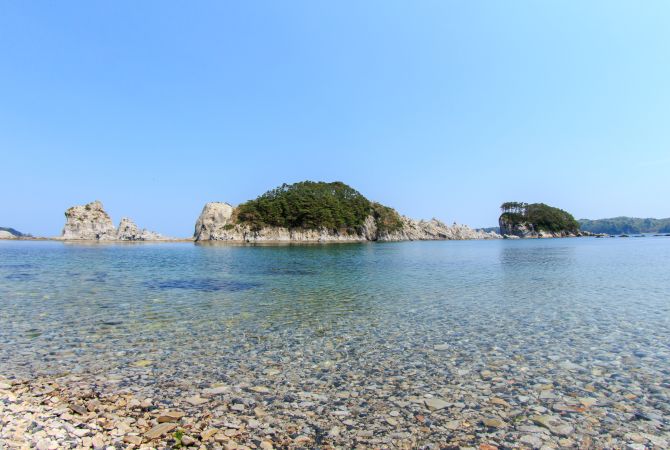 净土之滨被认为是日本最好的海滩之一。由于这里水湾受到海岩的遮挡庇护,因此一年四季都风平浪静。夏季,来自日本各地的游客纷纷涌向海滩,这里可能会特别拥挤。前来游玩时请带上凉鞋或鞋子,因为它是一个卵石(而非细沙)海滩。