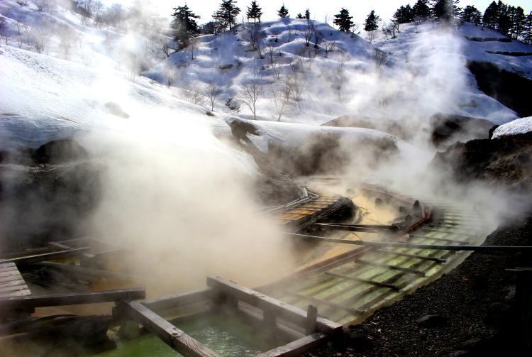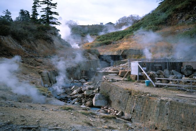 玉川温泉的酸度为日本温泉之最。岩床散发微量的辐射。日本各地的民众都会来此泡汤,期望能治疗各种疾病。