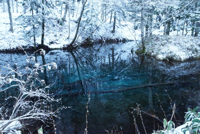 冬季时阳光微弱,在白雪的映衬下,池水会变成靛蓝色。红点鲑在池中纵横交错的树木间穿梭。这里是拍照的好地方,所以记得一定要带上相机。