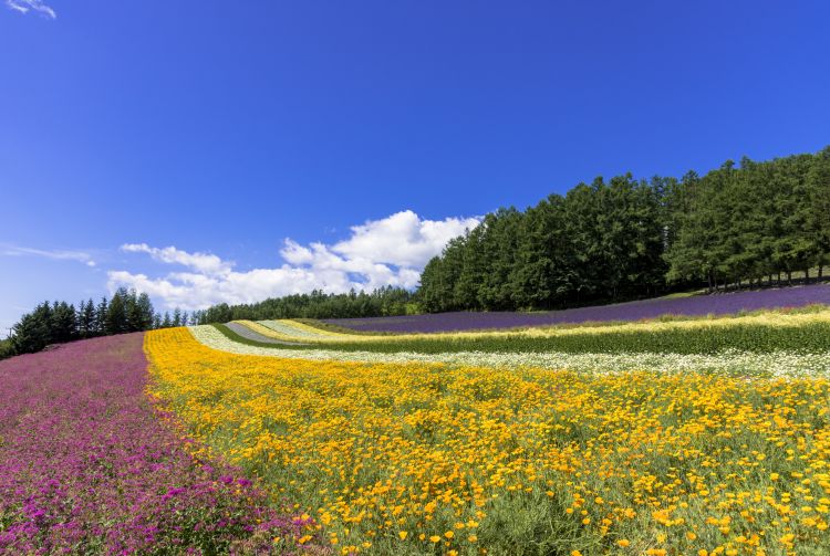 色彩明亮鲜艳的富良野花田,为北海道壮观的自然景观锦上添花。每一年,熏衣草、德国鸢尾、三色堇与耧斗草都会同时争相绽放。