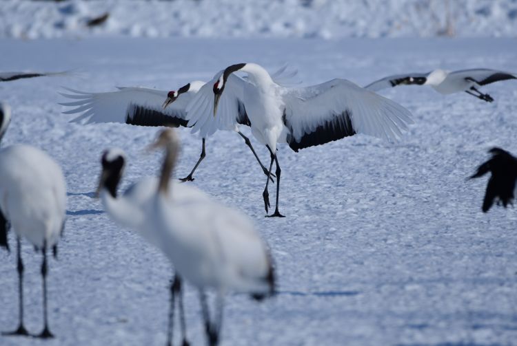 丹顶鹤往往在冬天群聚,因此更有机会观赏到它们的身影。冬季的多个喂食点都会聚集大量丹顶鹤,其中以伊藤鹤居最为知名。